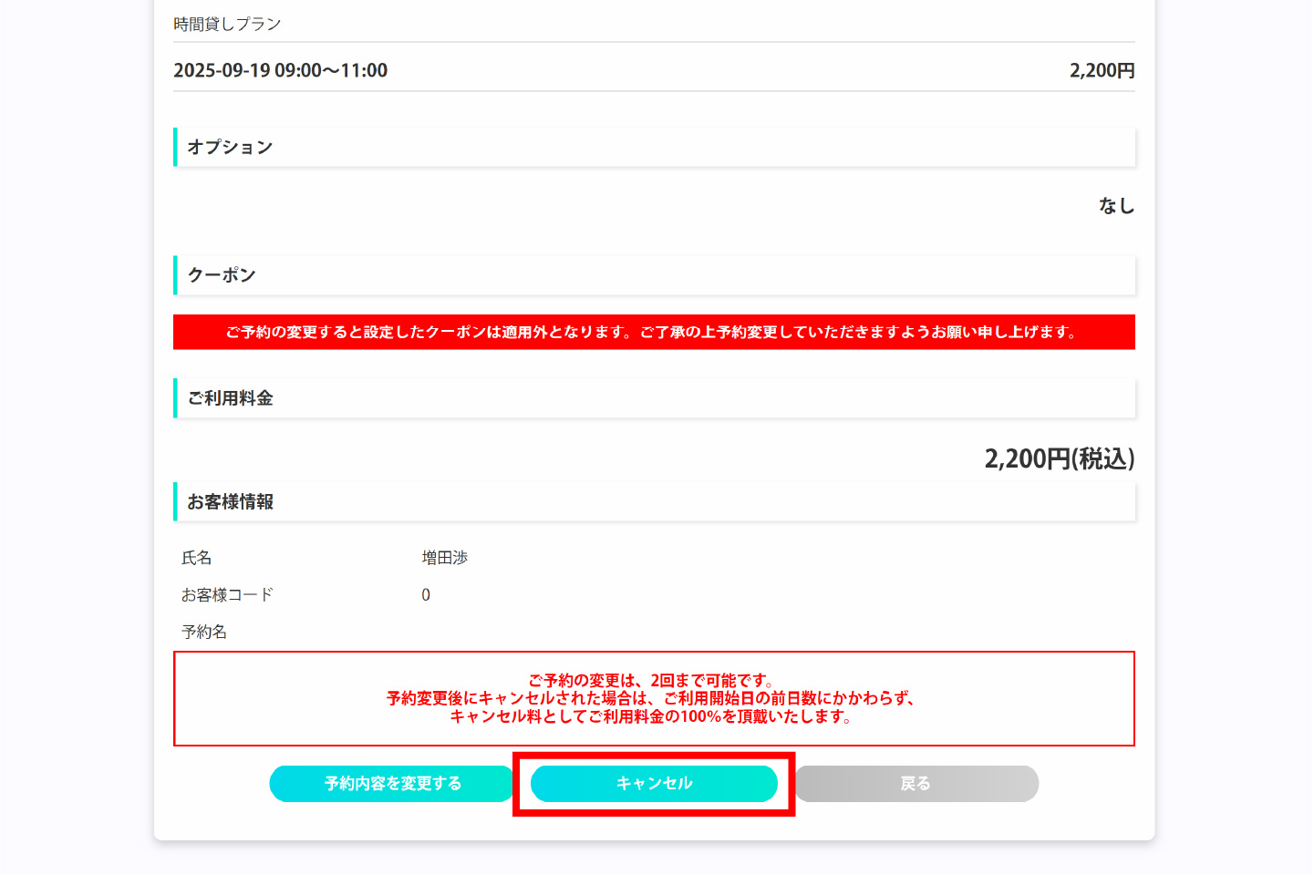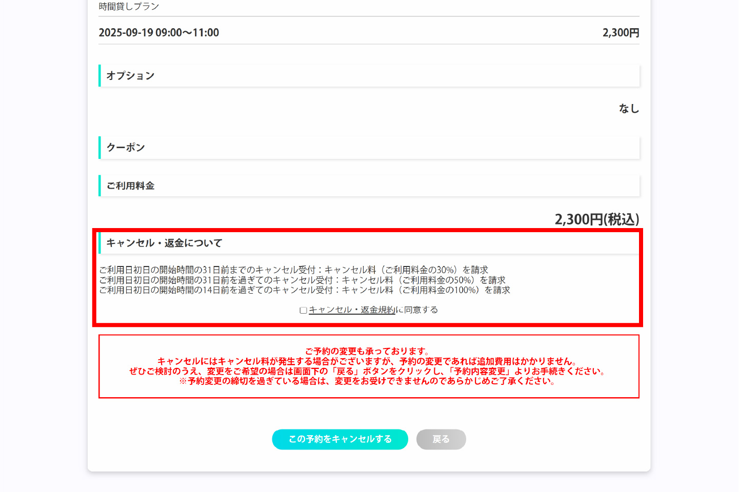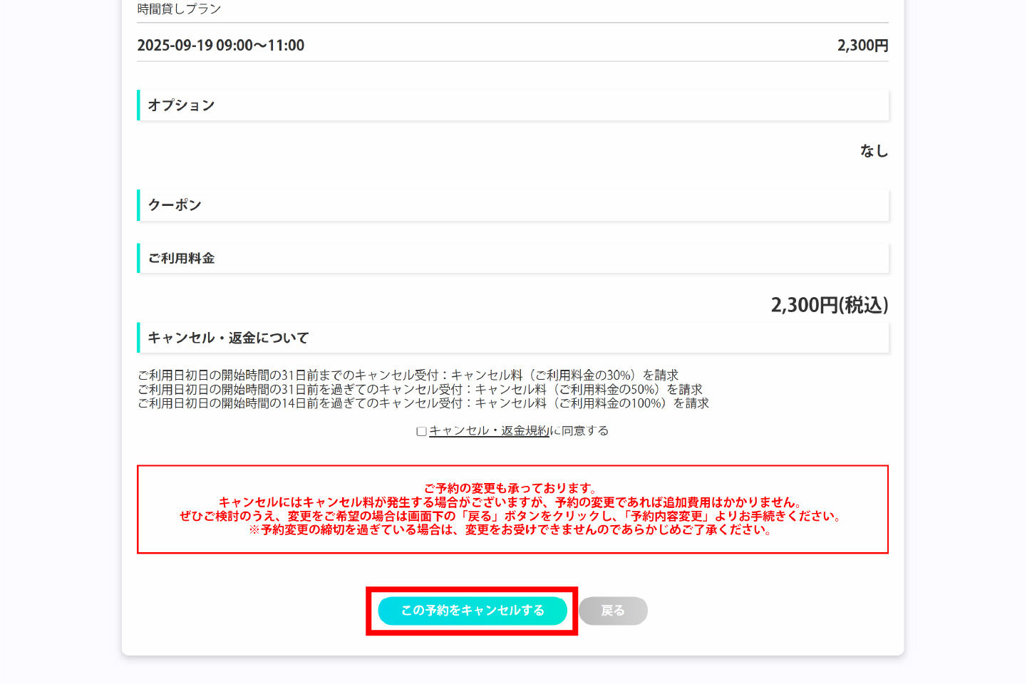 ・予約変更後にキャンセルする場合は、ご利用開始日の前日数にかかわらず、キャンセル料としてご利用料金の100%を頂戴いたします。