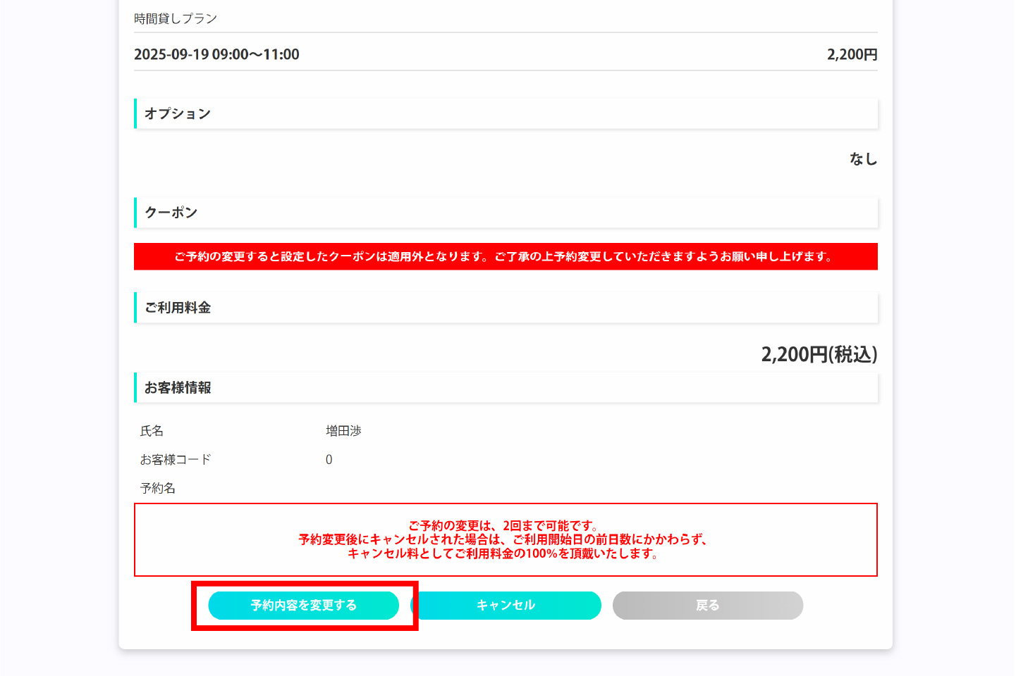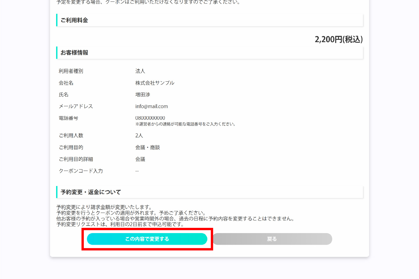 変更内容を確認し、「この内容で変更する」をクリックし、予約変更は完了です。