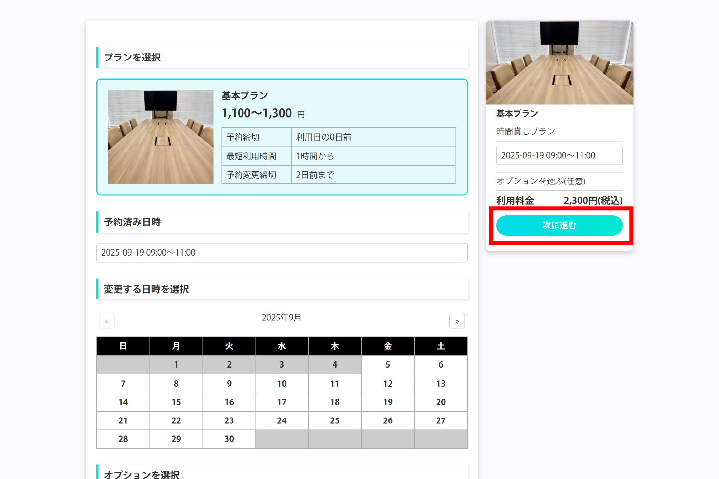 変更内容を設定し、「次に進む」をクリックし、予約変更内容確認画面に移動する。