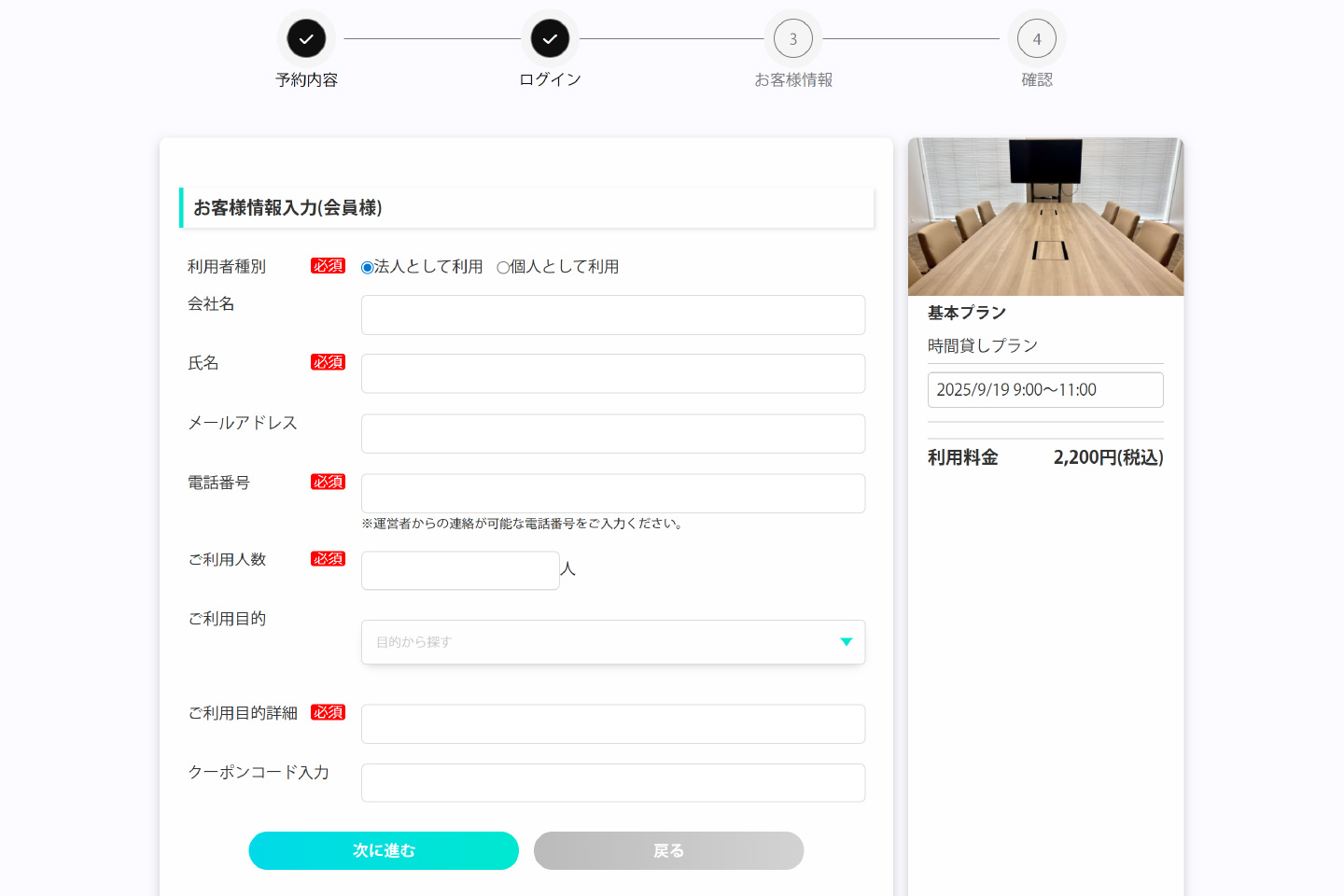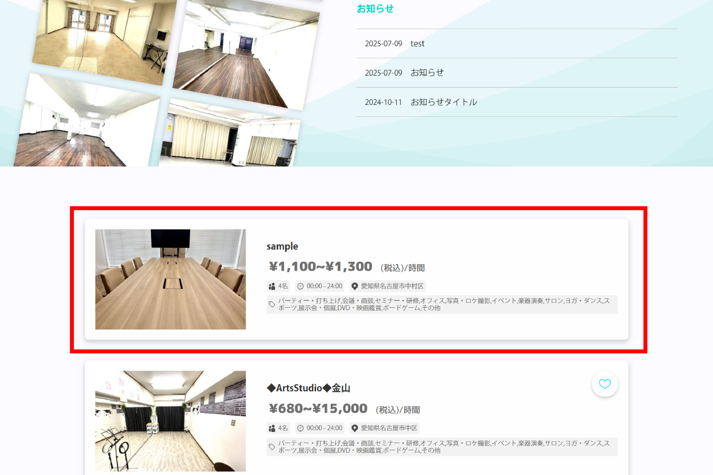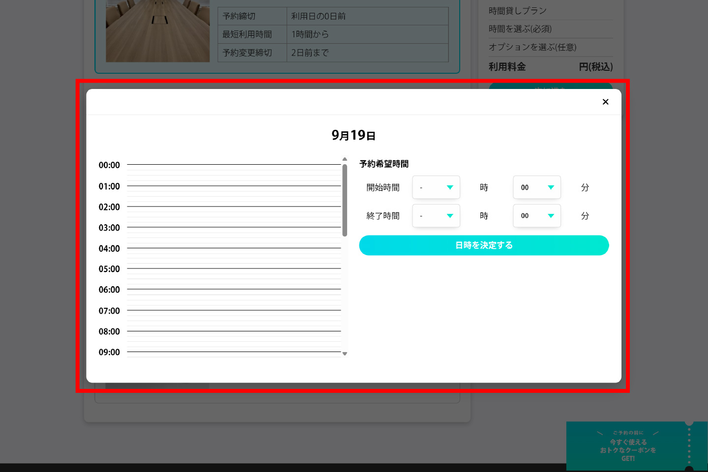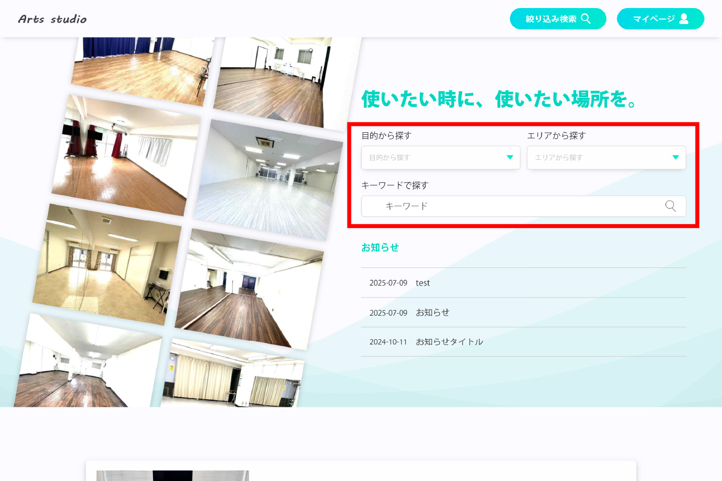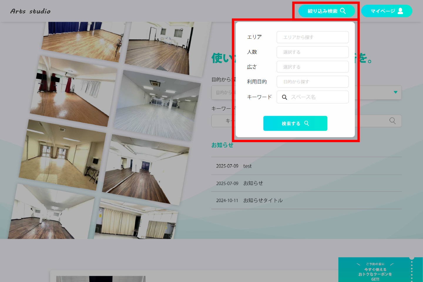 キーワード検索や、ご希望のエリア、利用目的でスペースを絞り込むことができます。